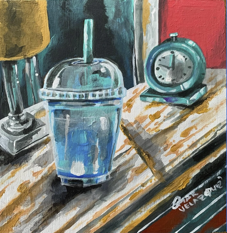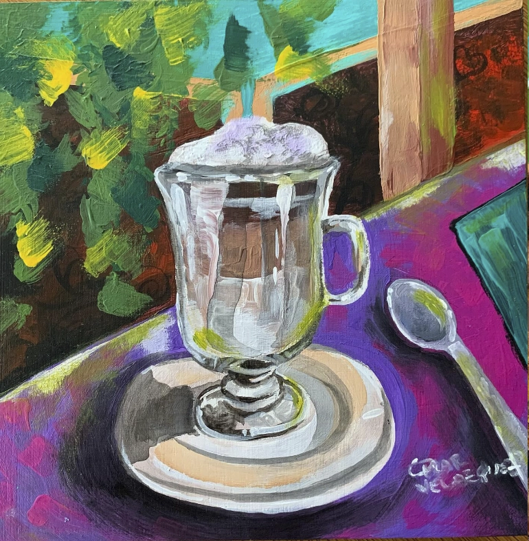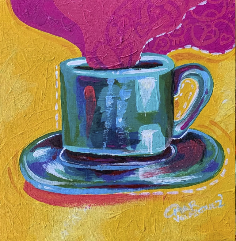 Frente al lienzo estaba yo disfrutando de mi café quien al primer descuido descendió de la taza y se mezcló con mis garabatos estando mi paladar y mis pinturas ensimismadas sin más remedio que fusionarse en un juego de manchas de luz y color. Un café al día nace de ese soberado gusto de cambiar, de acuerdo al humor la mezcla de esa bebida de extracto de grano y su temperatura para ser ingerido.