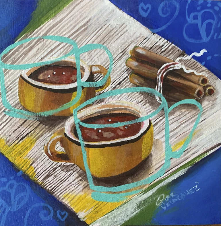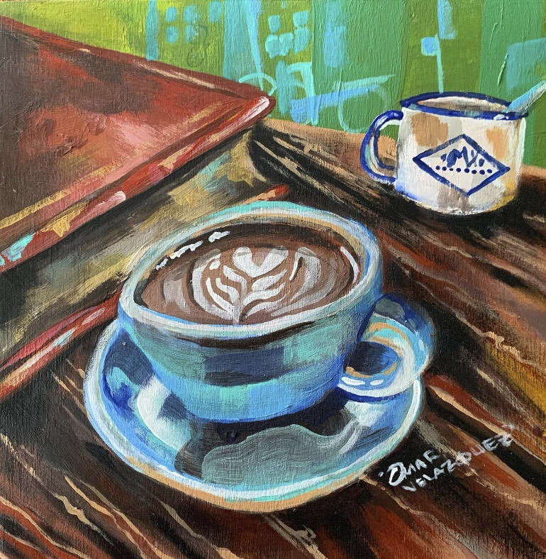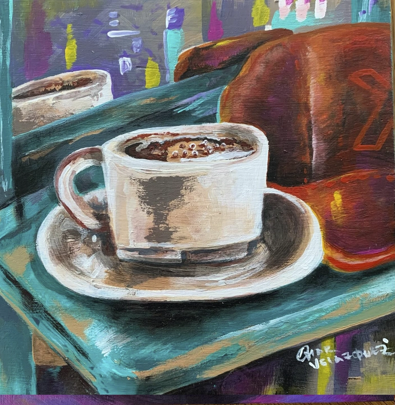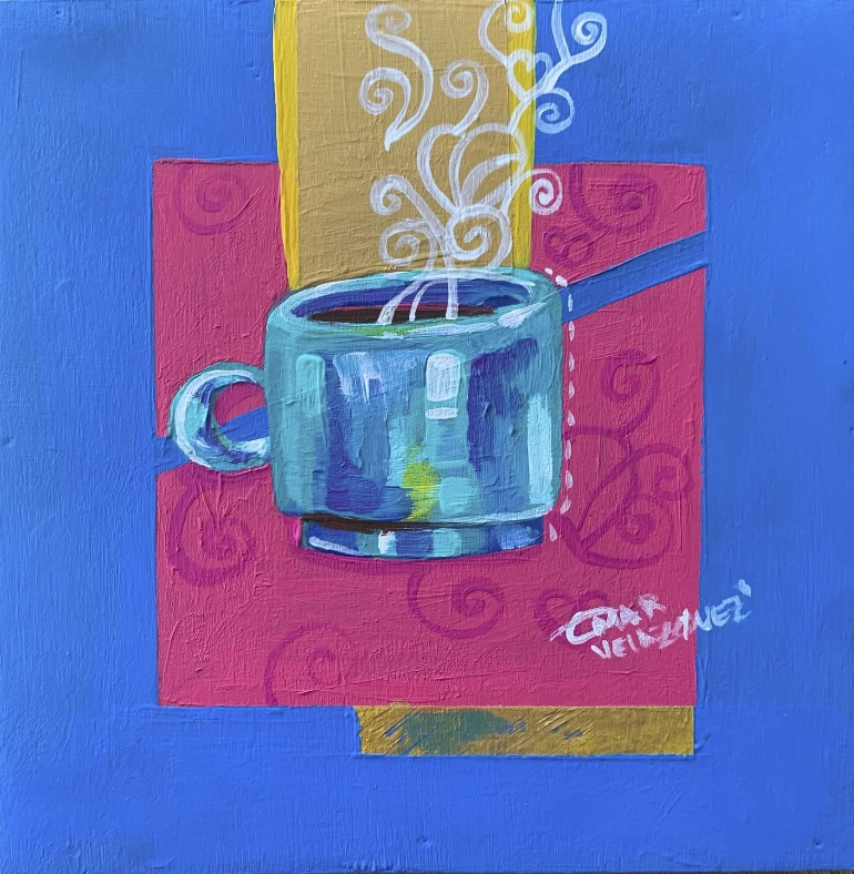 Frente al lienzo estaba yo disfrutando de mi café quien al primer descuido descendió de la taza y se mezcló con mis garabatos estando mi paladar y mis pinturas ensimismadas sin más remedio que fusionarse en un juego de manchas de luz y color. Un café al día nace de ese soberado gusto de cambiar, de acuerdo al humor la mezcla de esa bebida de extracto de grano y su temperatura para ser ingerido.